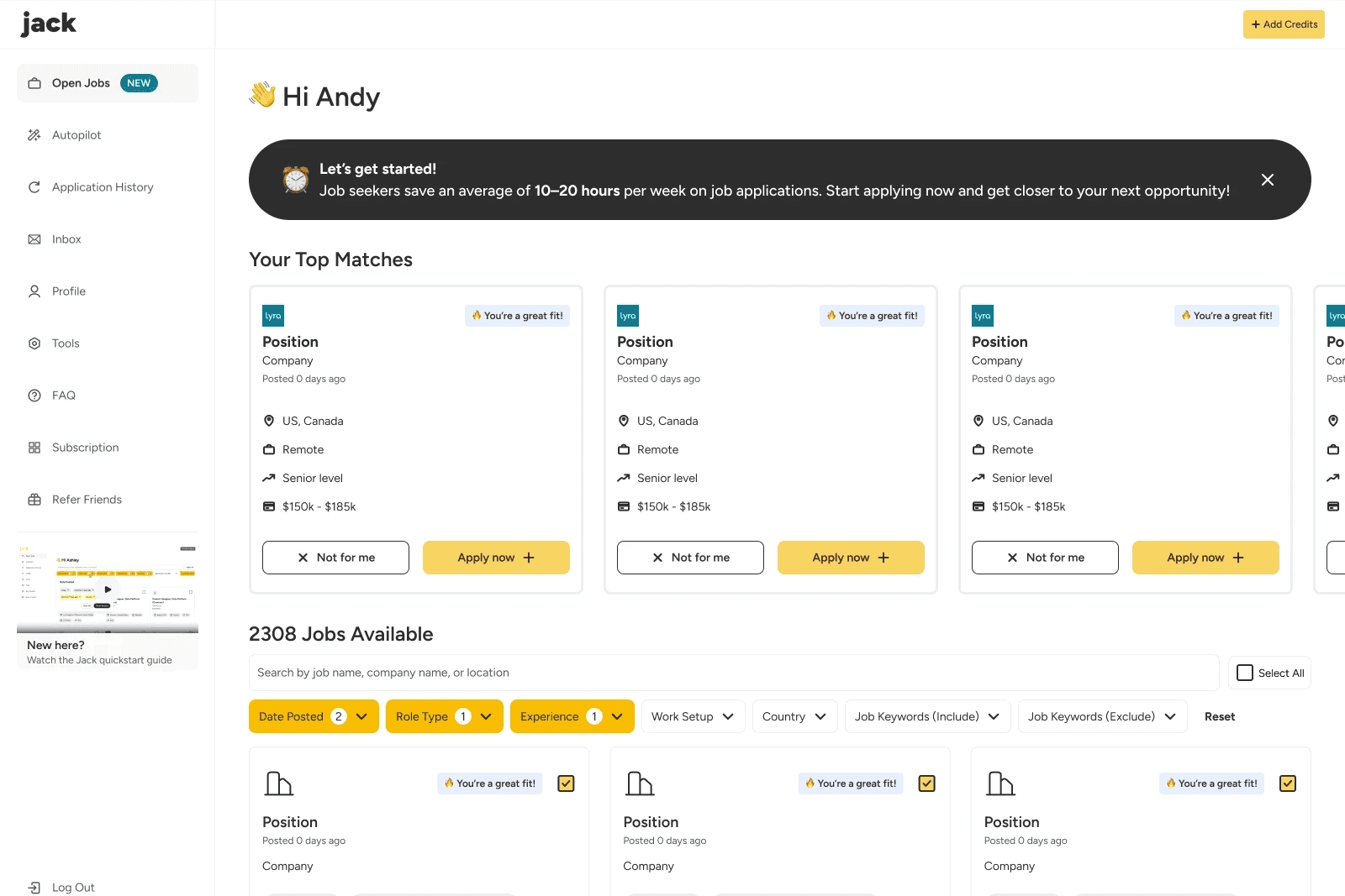 Added a separate section that highlights jobs with highest matching scores. We also added banners at the top to remind users to setup Autopilot. These updates clearly communicates both features and prompts quicker action.