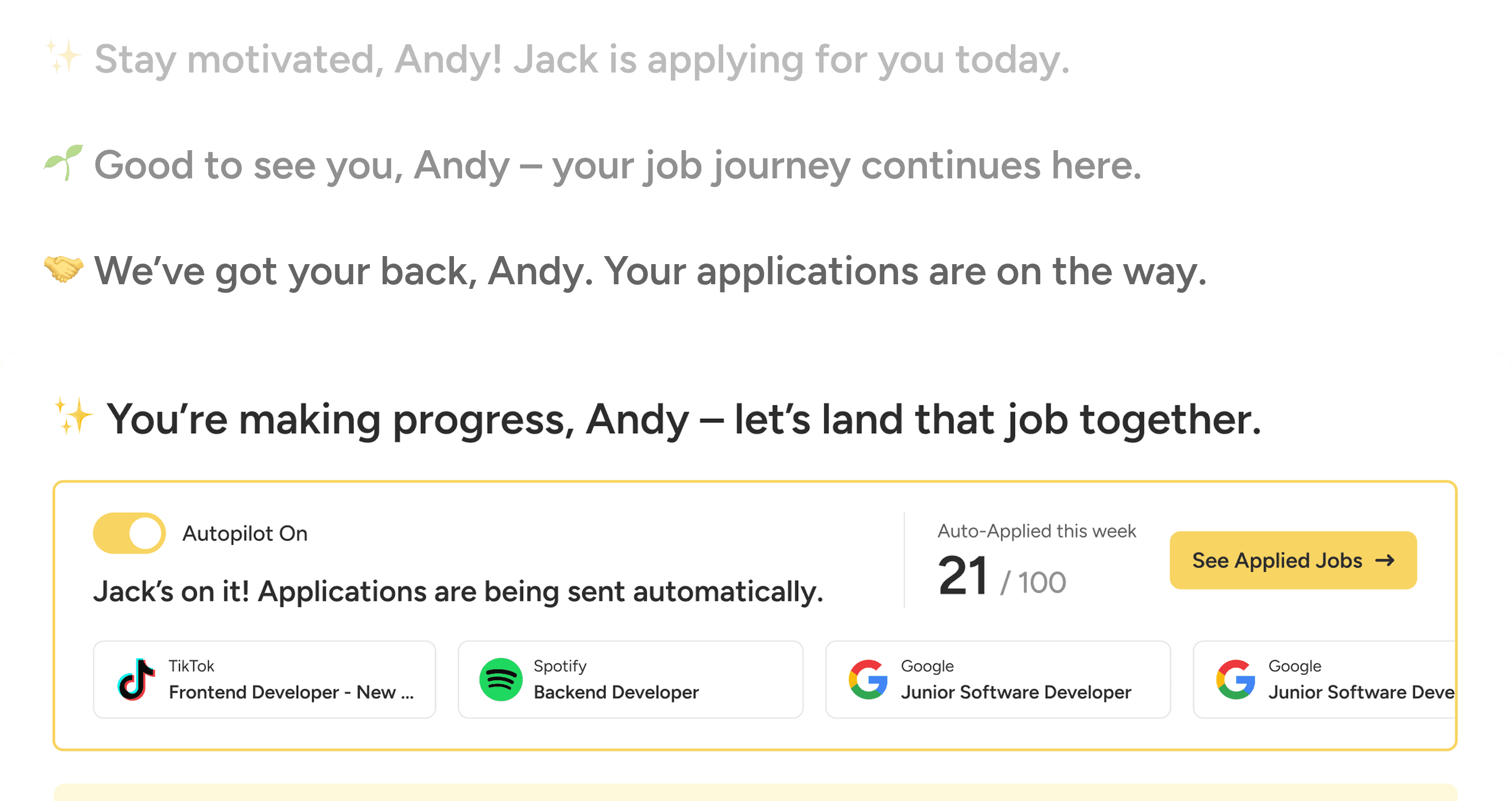 Job searching can often feel stressful and discouraging. By adopting a more personal tone and incorporating encouraging language throughout the experience, it helps users feel understood and supported, strengthening trust and increasing their willingness to continue using Jack.